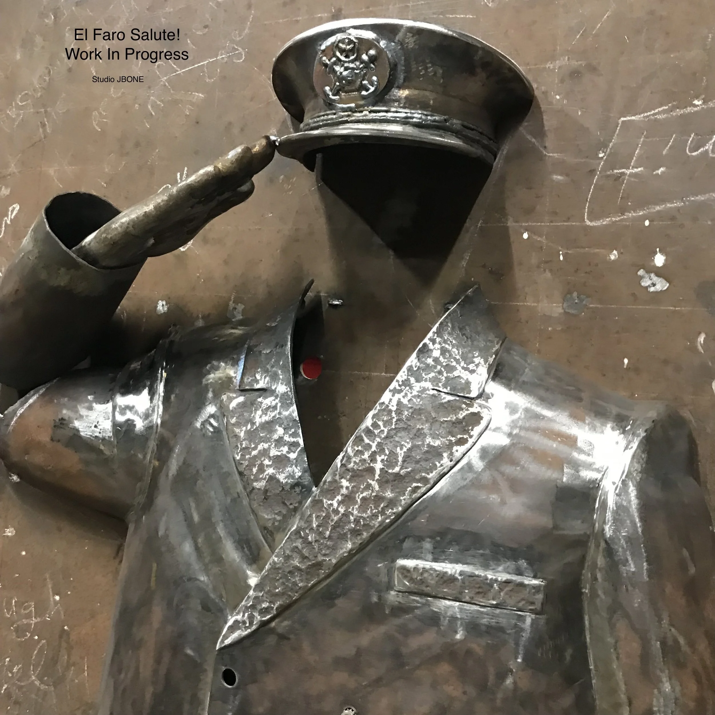 Following is my description of the memorial that was part of the Project Overview in early promotion: El Faro Salute! will consist of a granite base supporting two maritime officer jackets and caps created with this same technical process and material as The Maestro!. Both sculptures will be formed in the full salute position, symbolizing the respect offered by the maritime community toward the entire crew of the El Faro. Welds at the extended fingertips of the saluting hands will support the caps. Space under the caps is purposely left void of any representation toward a particular person, leaving interpretation to the individual viewer. The precise design of the granite base is being finalized to set the stage for supporting the metal sculptures. A distinguished plaque will include the names of each crew member.