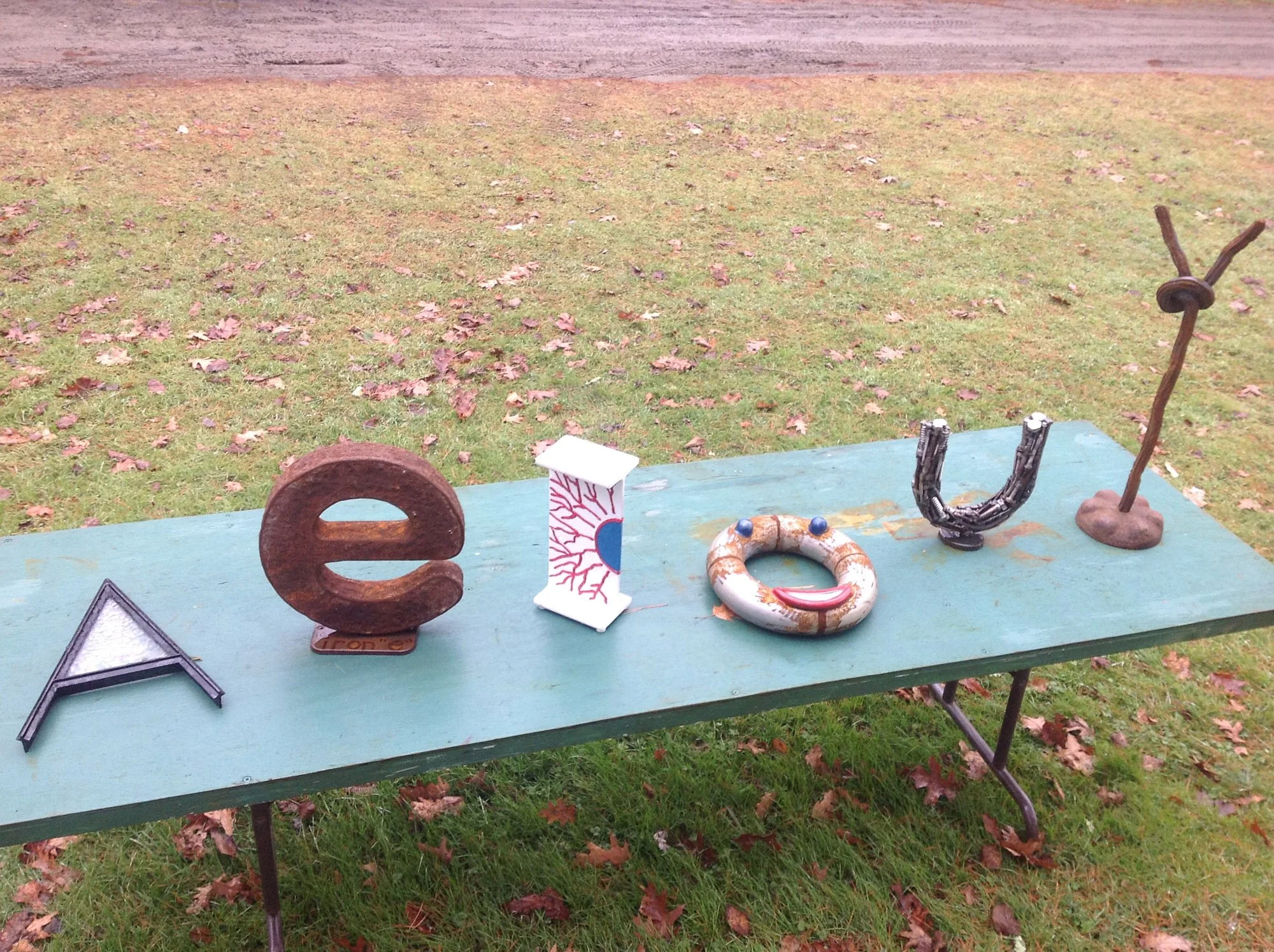 Original members of Sculpture Soup consisted of the vowels. In this early image Cheery O and Y Knot have not been painted yet.