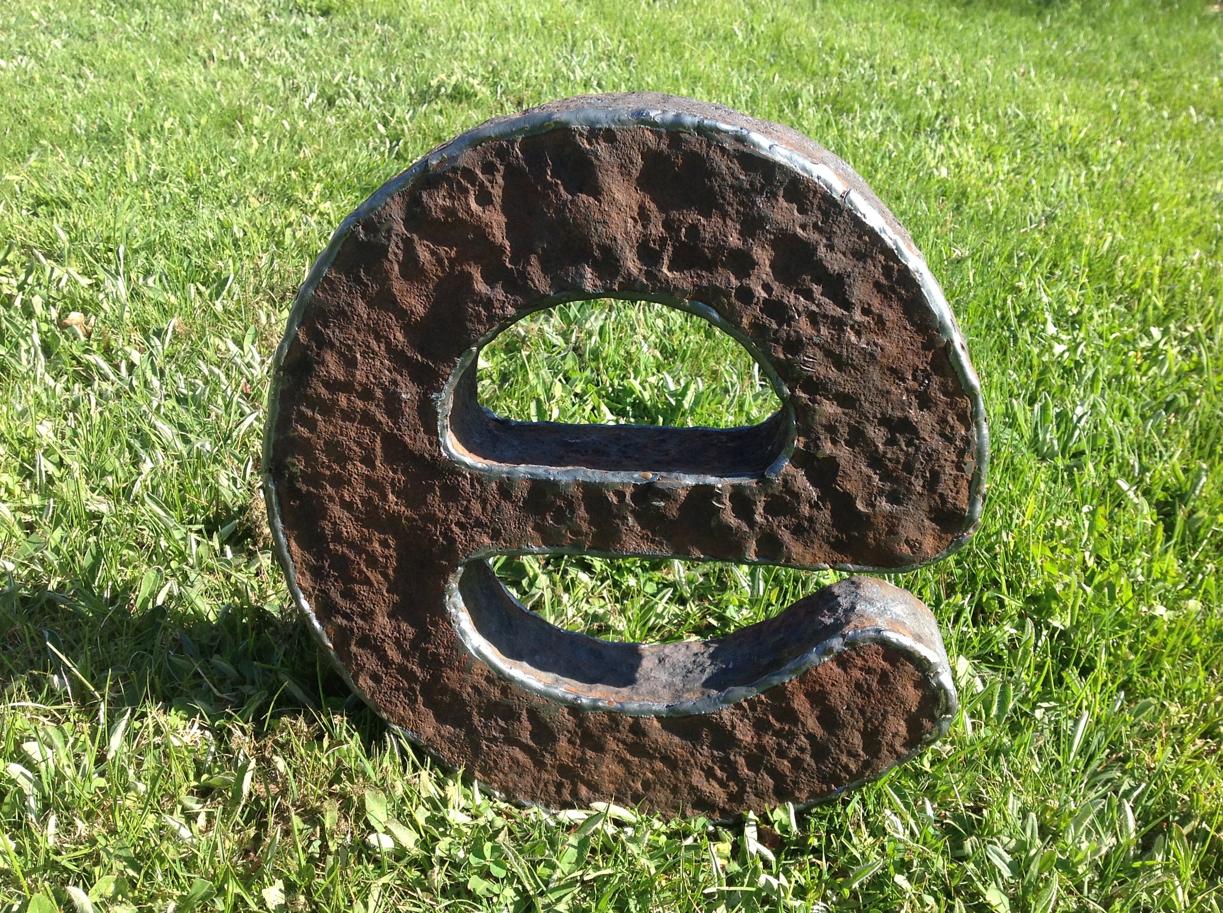 Sculpture Soup is a series of sculptures that straddle the intersection of humor and intellect with their expression while celebrating some of the idiosyncrasies of the English alphabet. The forerunner of the sculpture family is Iron e, which was created in early 2013. JBONE had in his possession about five ton of raw material with a rich patina and local history. The iron used in the construction of an industrial penstock had formerly been installed on the bed of the Saint George River in his home town of Warren, Maine. It served as part of the system that allowed the former Georges River Woolen Mill to be powered by the passing water. This mill had previously been the economic engine of the small town for over a hundred years.